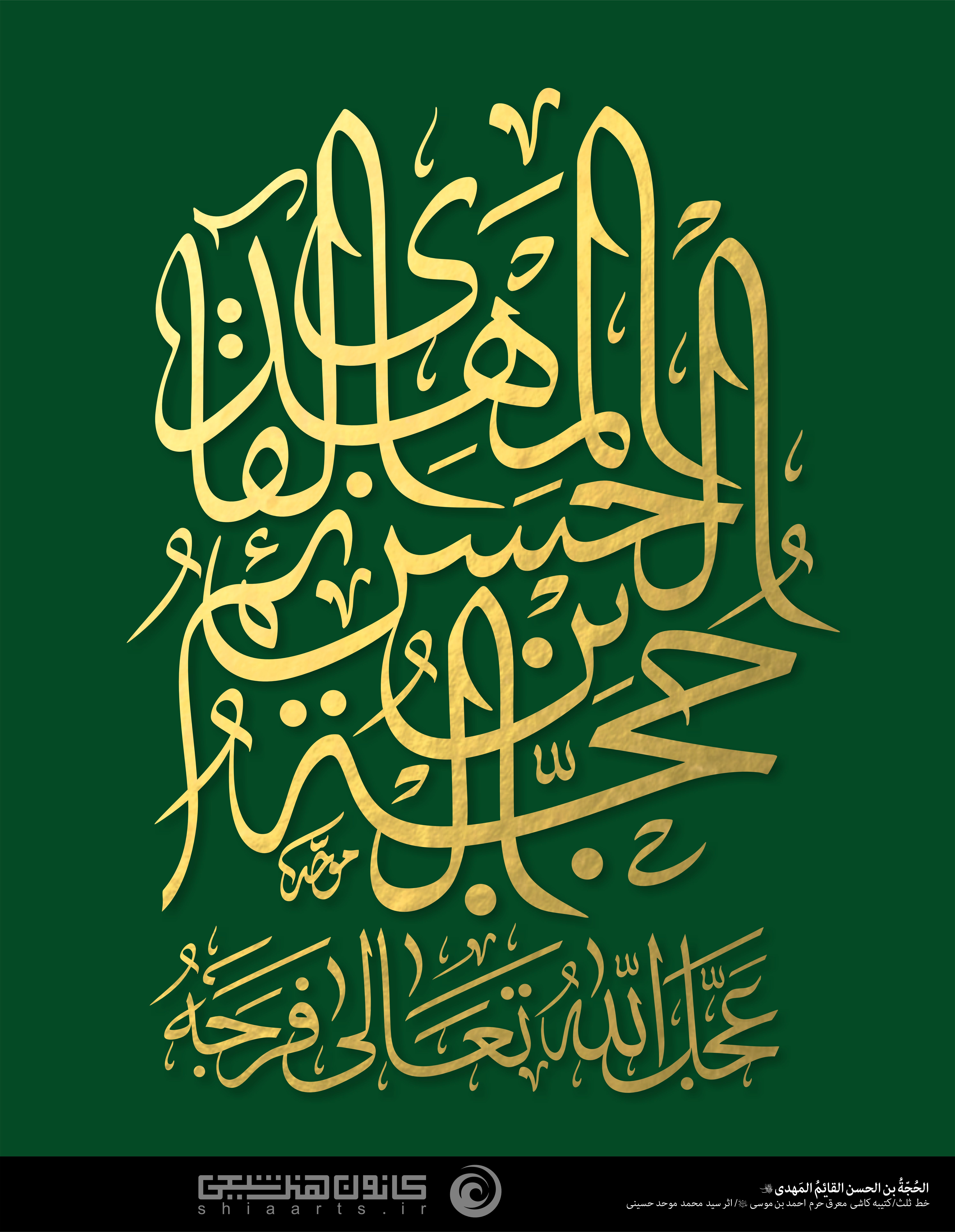 کتیبه کاشی در حرم مطهر حضرت احمد بن موسی الکاظم (علیهما السلام) منقش به نام مبارک "الحجة بن الحسن القائم المهدی (عجل الله تعالی فرجه الشریف)" با خط ثلث