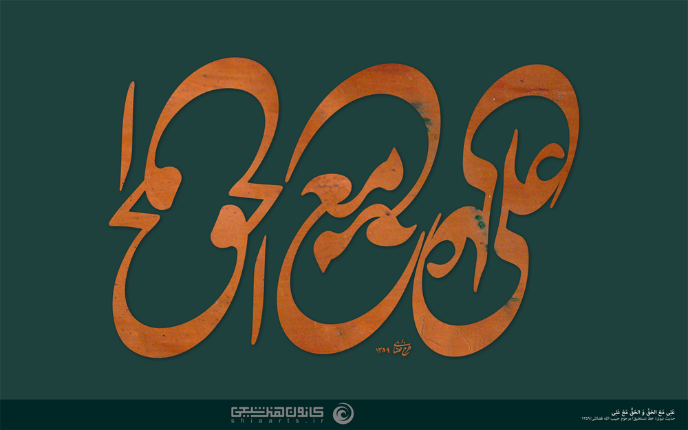 کتابت حدیث شریف نبوی (صلّی اللّه علیه و آله و سلم): «عَلِیٌّ مَعَ الْحَقِّ وَالْحَقُّ مَعَ عَلِیٍّ»؛ امیرالمؤمنین علی (علیهالسلام) همواره همراه حق و حق همواره با علی (علیهالسلام) است - تنکابنی، ضیاء القلوب، ۱۳۸۲ش، ج۲، ص۲۰۳.با خط کوفی بنایی