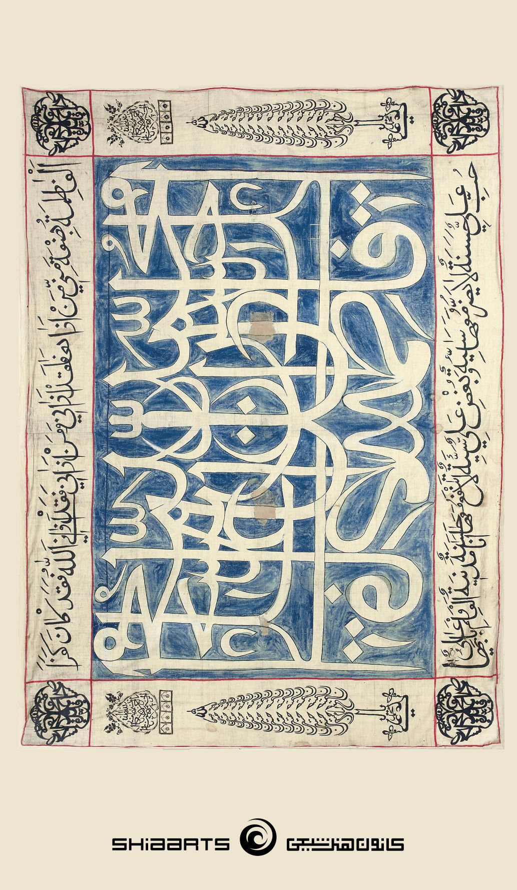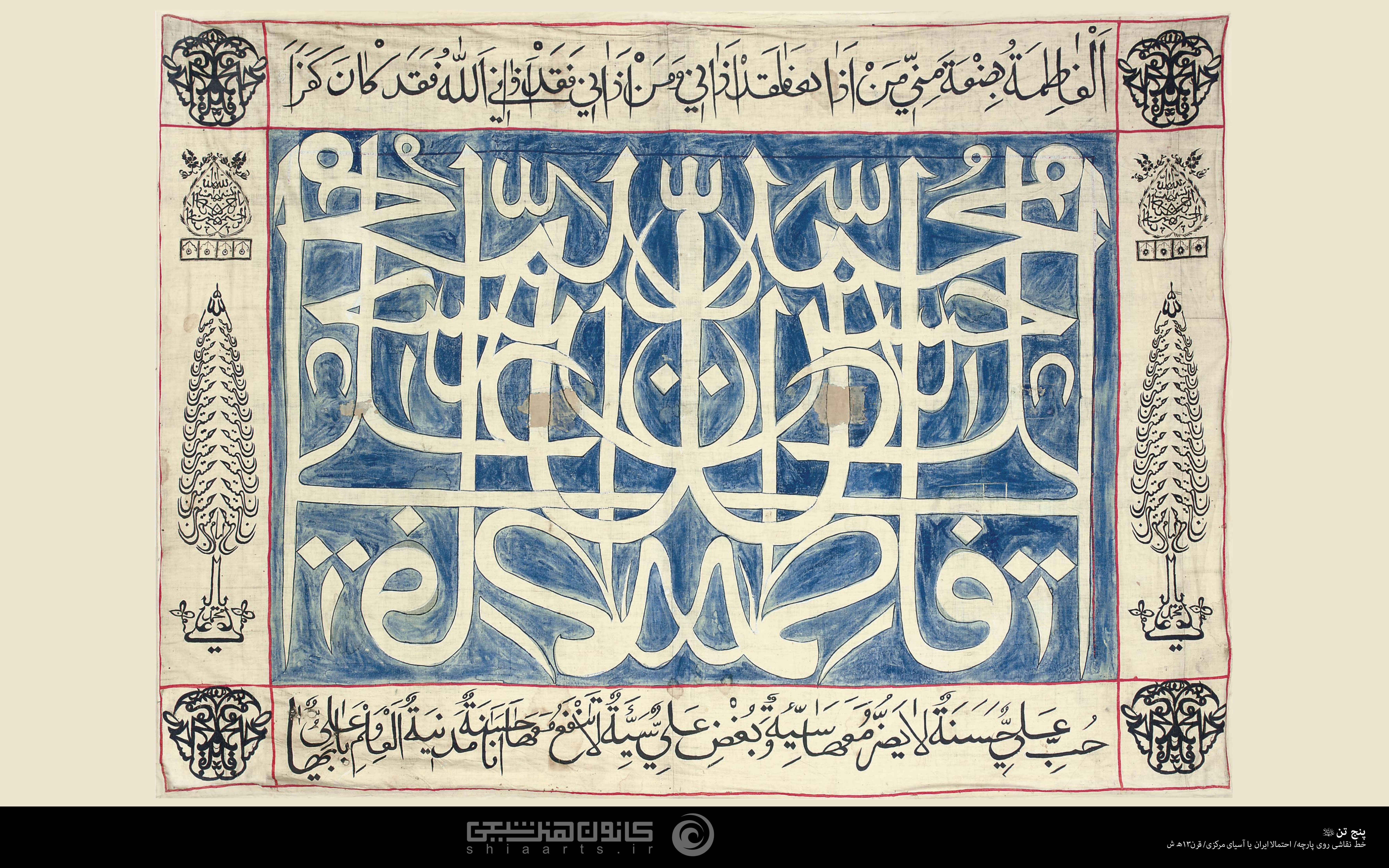 خط نقاشی روی پارچه اسامی مبارک پنج تن (علیهم السلام) همراه با احادیث: